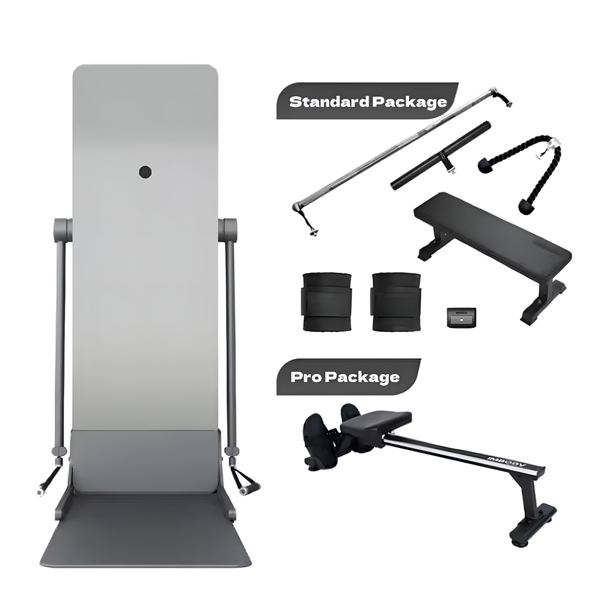 Standard Package: Straight bar, short bar, tricep rope, flat bench, ankle cuffs, wireless remote